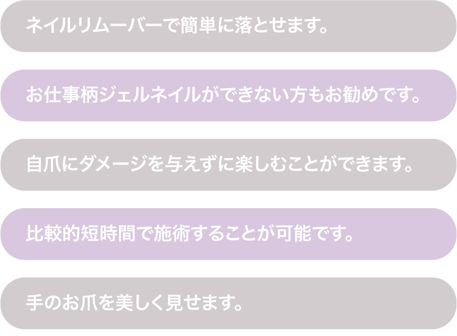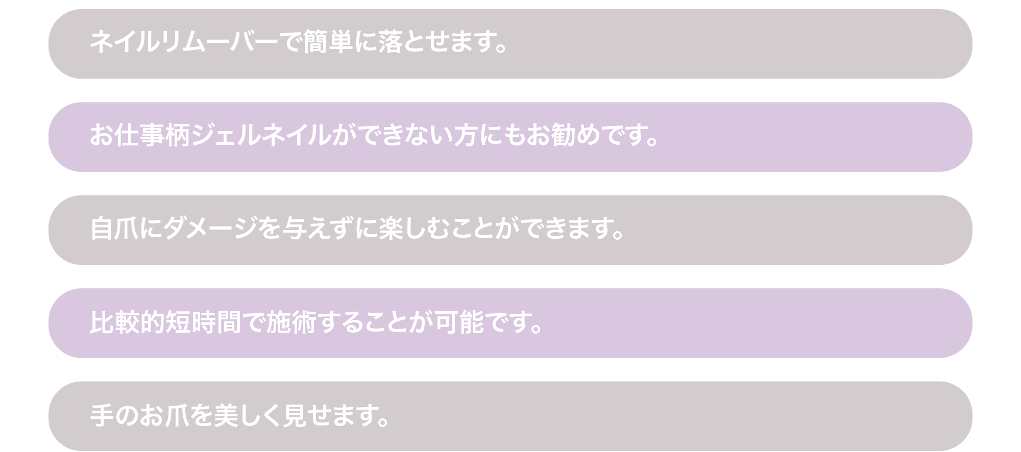 ネイルリムーバーで簡単にオフが出来るので、自爪にダメージを与えずに楽しむことができます。イベントなど数日だけ楽しみたい方に最適です。