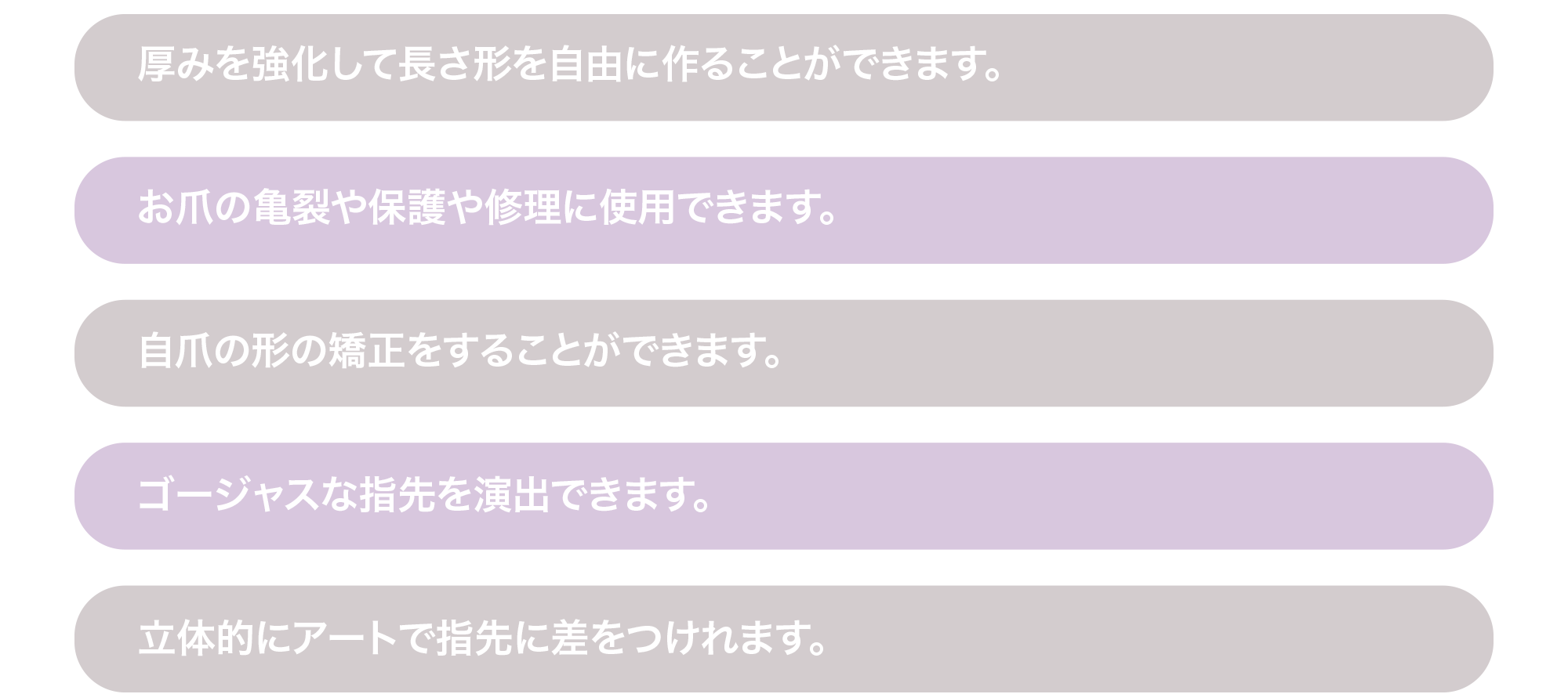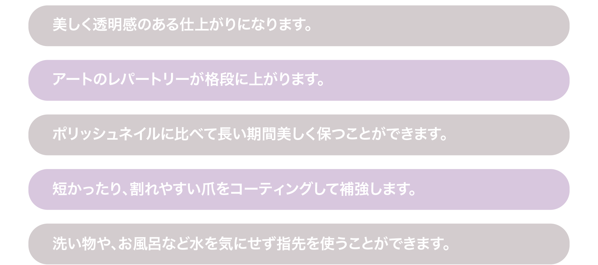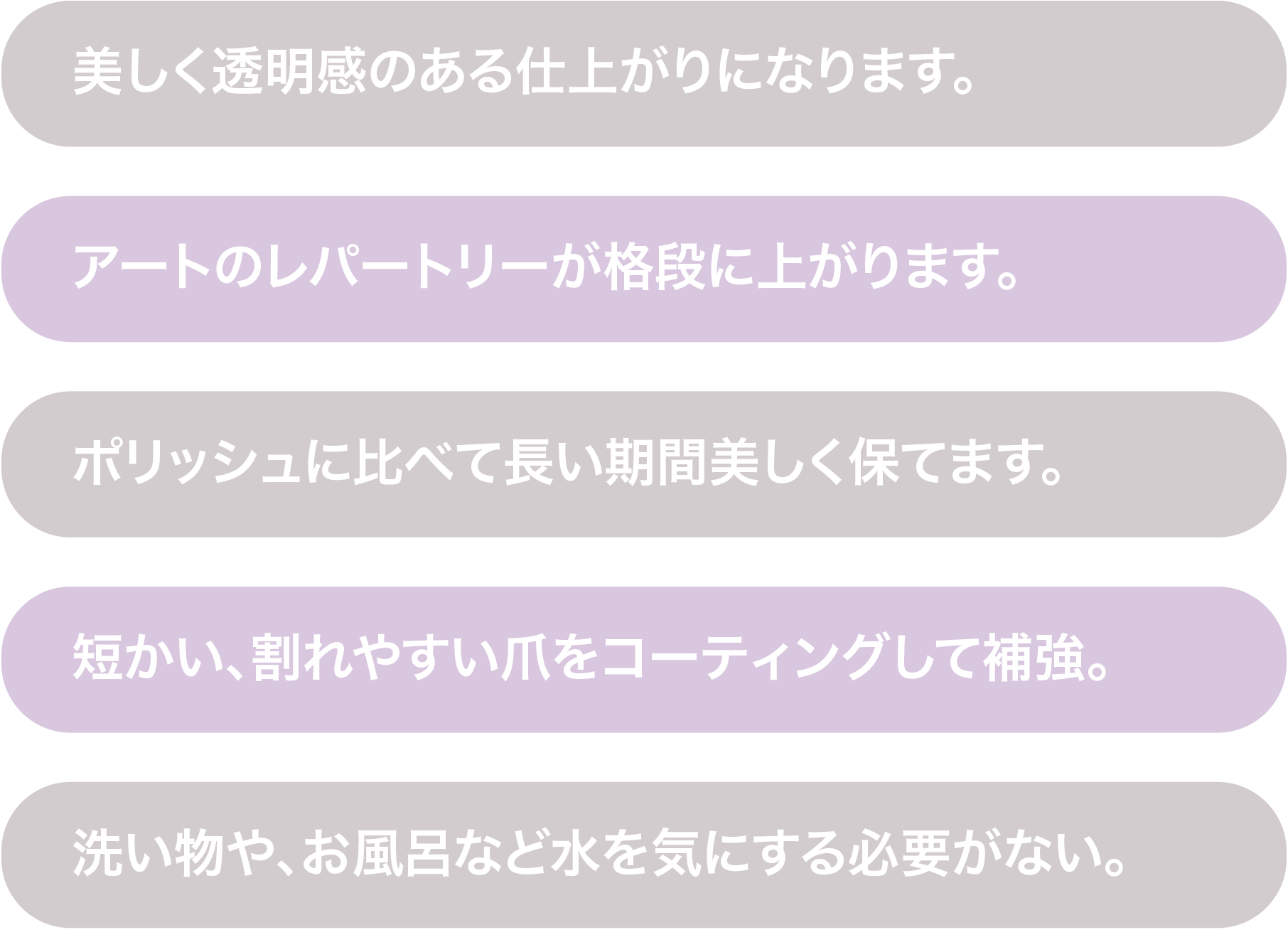爪をコーティング&補強して、美しく透明感のある仕上がりになります。アートのレパートリーが格段に上がります。