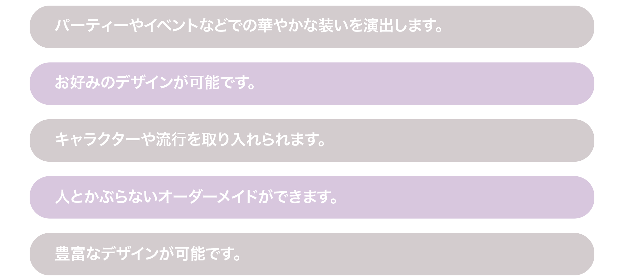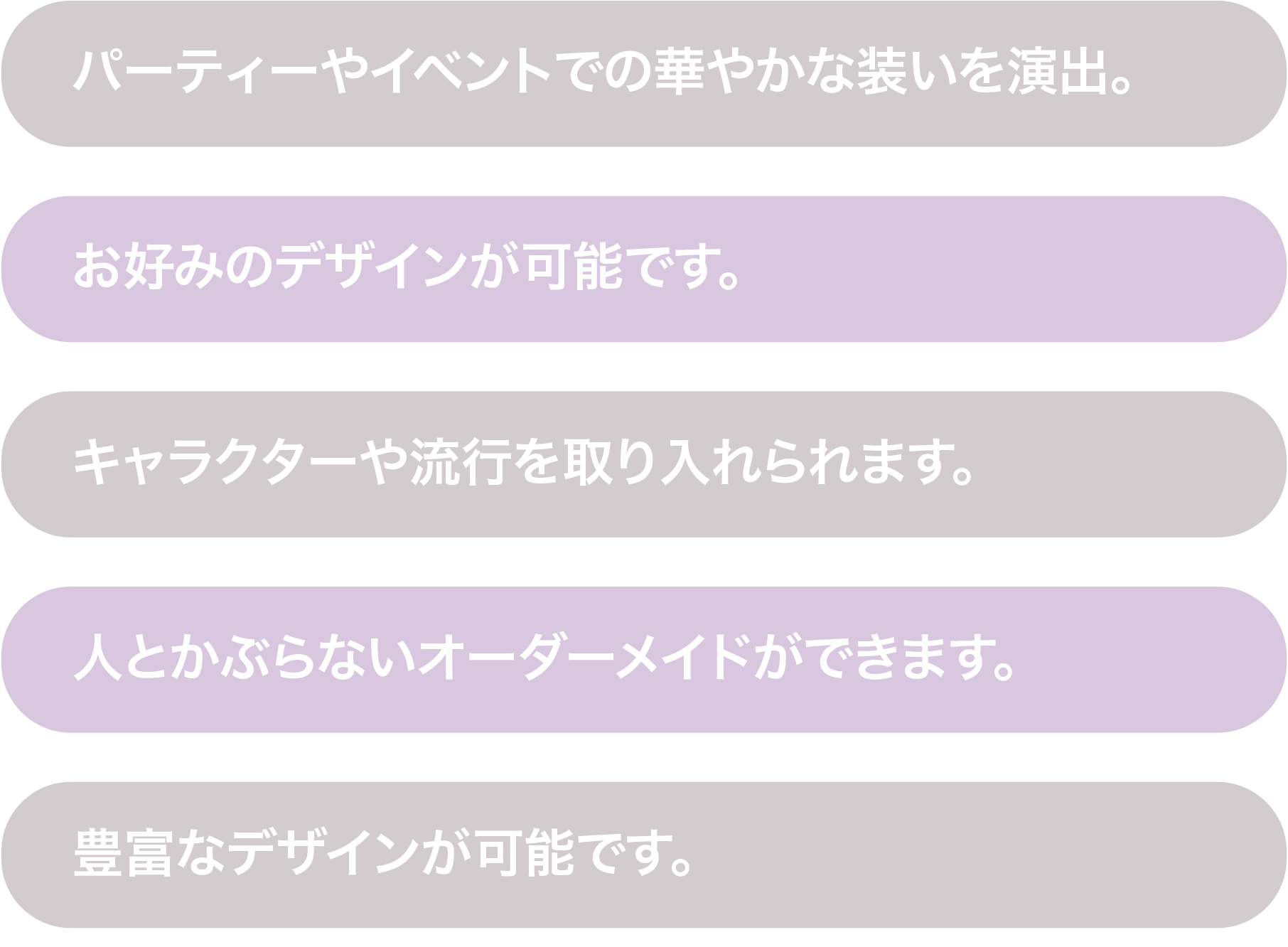 パーティーやイベントなどでの華やかな装いを演出。キャラクターや流行を取り入れるなど、オーダーメイドでオリジナルなデザインが可能です。