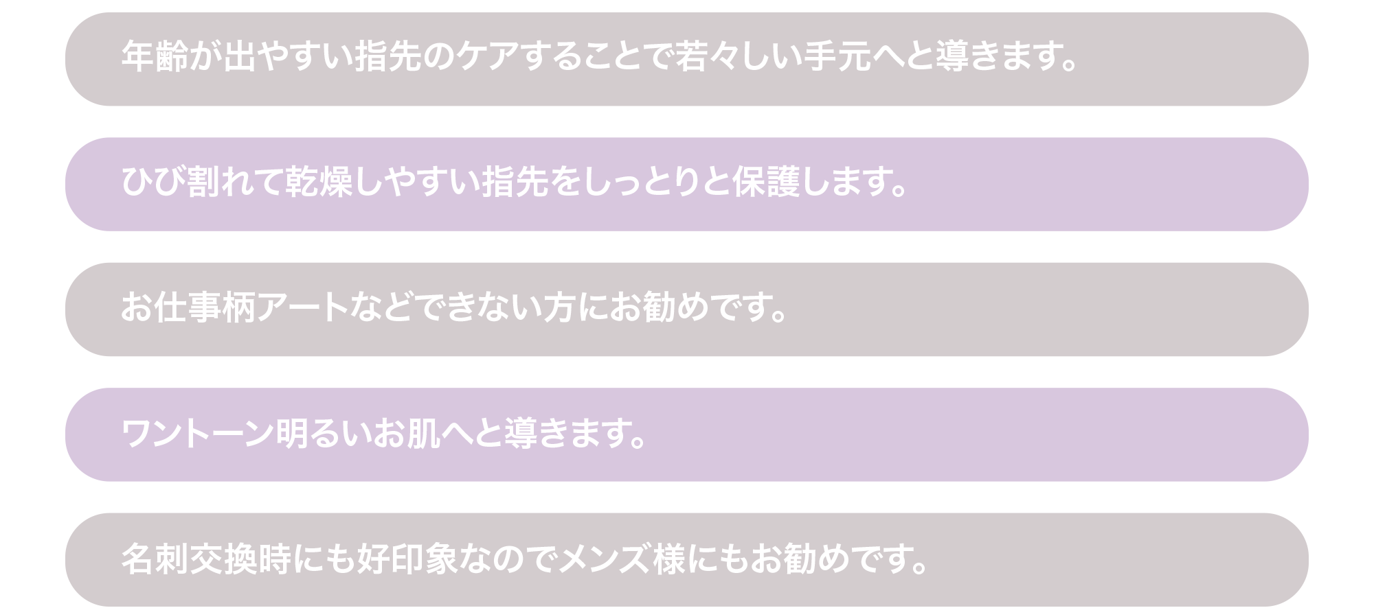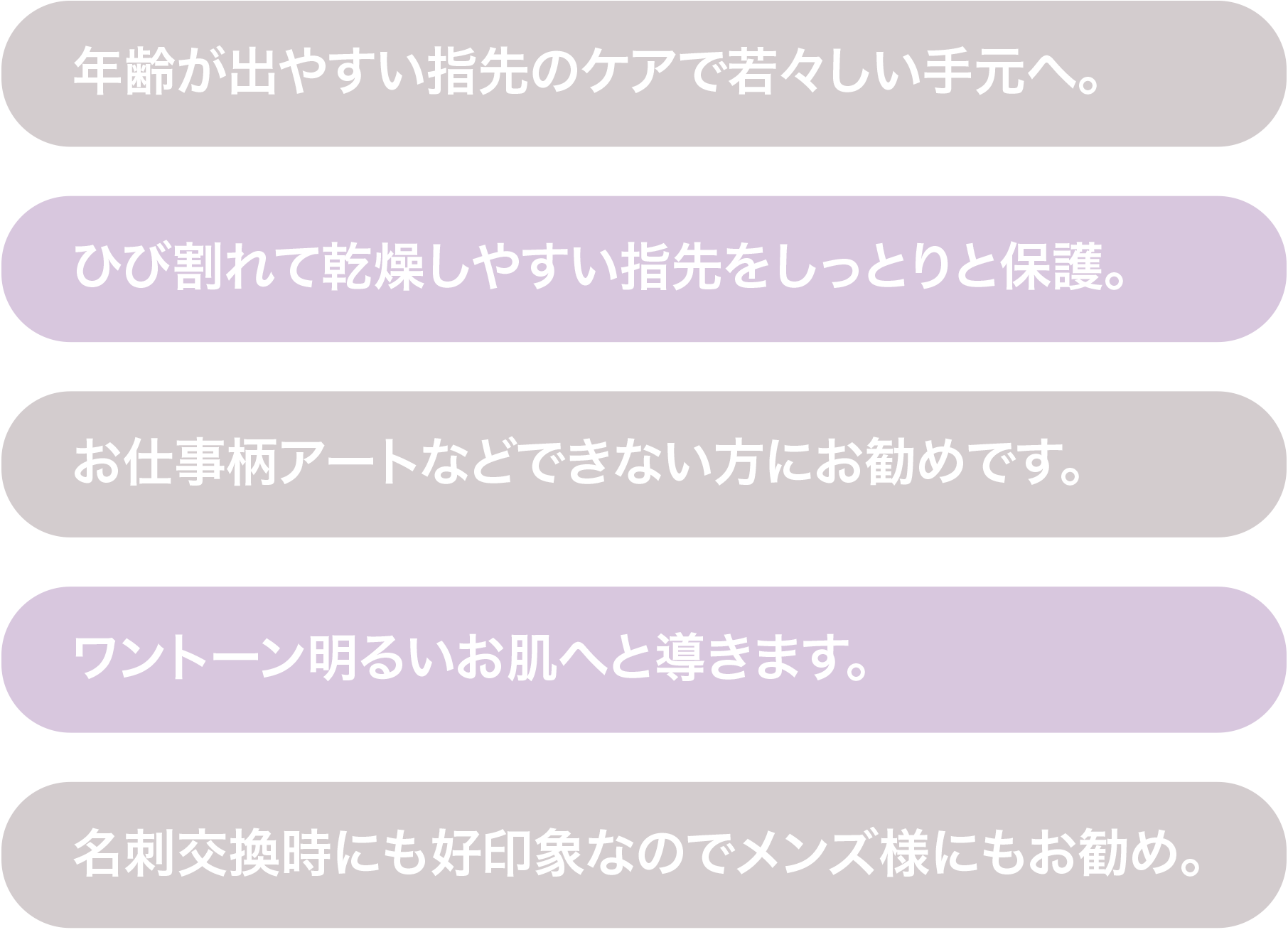 年齢が出やすい指先のケアすることで若々しい手元へ。乾燥しやすい指先を保護しワントーン明るいお肌へ。名刺交換時にも好印象なのでメンズ様にもお勧めです。