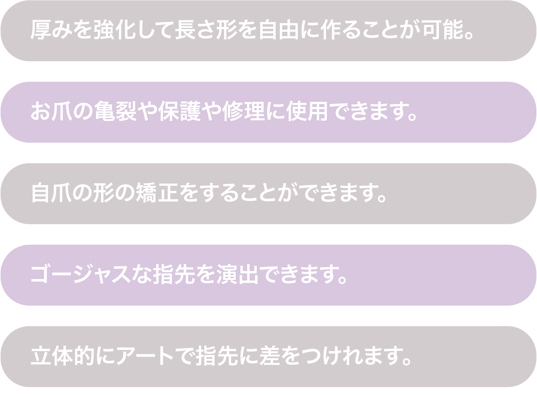 厚みを強化して長さ形を自由に作ることが出来るため、ゴージャスな指先を演出することが出来ます。立体的にアートで指先に差をつけれます。