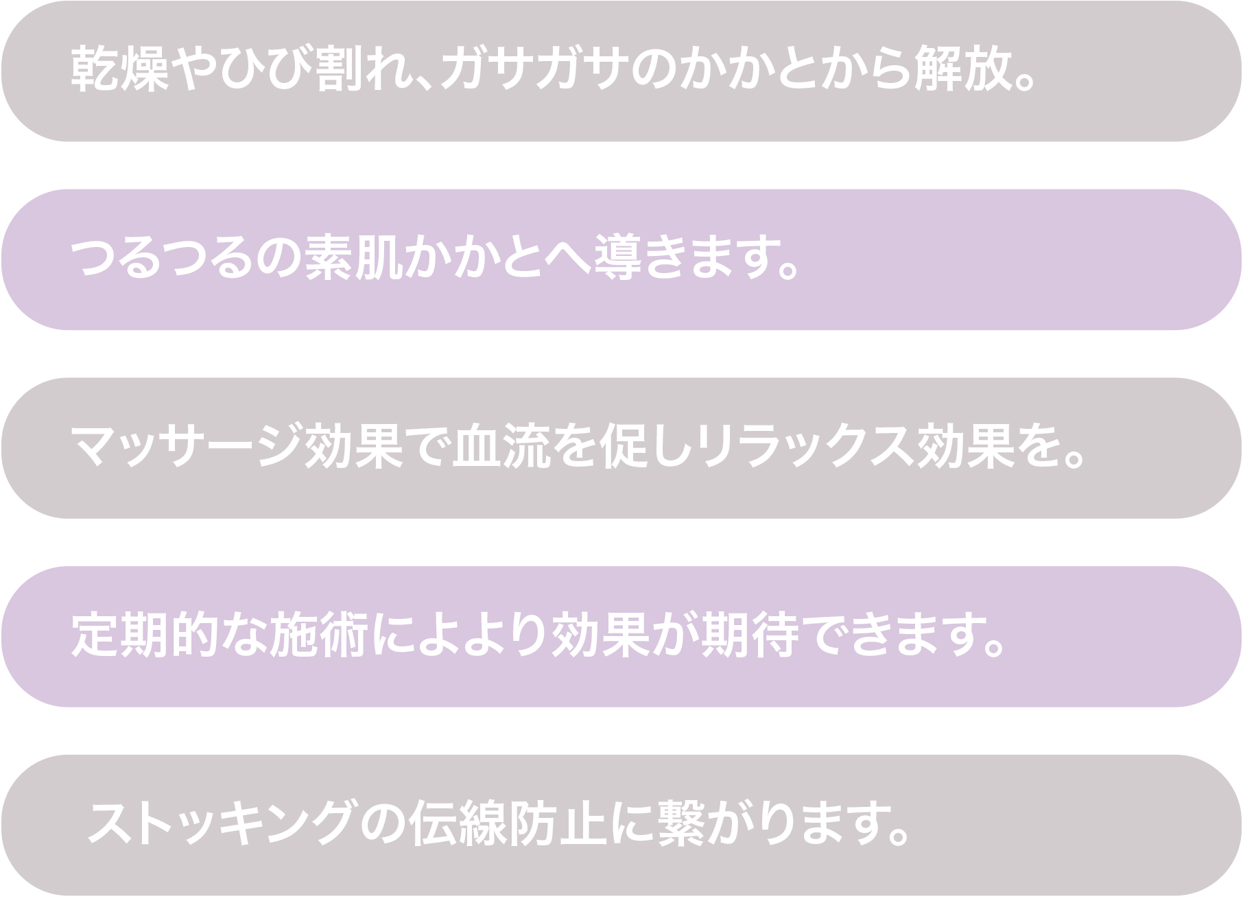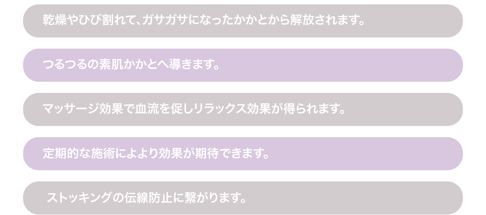 乾燥やひび割れを改善し、つるつるの素肌かかとへ導きます。マッサージ効果で血流を促しリラックス効果が得られます。ストッキングの伝線防止に繋がります。